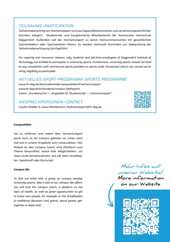 106TEILNAHME %ufffd PARTICIPATIONTeilnahmeberechtigt am Hochschulsport sind aus kapazit%u00e4tstechnischen und versicherungsrechtlichen Gr%u00fcnden lediglich Studierende und hauptamtliche Mitarbeitende der Technischen Hochschule Deggendorf. Au%u00dferdem soll der Hochschulsport zu keiner Konkurrenzsituation mit gewerblichen Sportanbietern oder Sportvereinen f%u00fchren. Es werden vereinzelt Kontrollen zur %u00dcberpr%u00fcfung der Teilnahmeberechtigung durchgef%u00fchrt.For capacity and insurance reasons, only students and full-time employees of Deggendorf Institute of Technology are entitled to participate in university sports. Furthermore, university sports should not lead to any competition with commercial sports providers or sports clubs. Occasional checks are carried out to verify eligibility to participate.AKTUELLES SPORT-PROGRAMM %ufffd SPORTS PROGRAMMEwww.th-deg.de/de/studierende/campusleben#hochschulsport www.th-deg.de/en/students/campus-life#sportsiLearn: %u201eKursbereiche%u201c > %u201eAngebote f%u00fcr Studierende%u201c > %u201eHochschulsport%u201cANSPRECHPERSONEN %ufffd CONTACTCarolin Stadler & Laura Wiedemann, hochschulsport@th-deg.deCampuslebenUm zu erfahren, was neben dem Hochschulsport sonst noch so am Campus geboten ist, schau doch mal rein in unsere Angebote zum Campusleben. Hier findest du den Campus Coach, eine Plattform zum Thema Gesundheit, sowie tolle M%u00f6glichkeiten, um neue Leute kennenzulernen, wie z.B. beim Schafkopfen, Spieletreff oder Buchclub!Campus lifeTo find out what else is going on campus besides university sports, take a look at our campus life offers. You will find the Campus Coach, a platform on the topic of health, as well as great opportunities to get to know new people, for example at the Schafkopfen (a traditional Bavarian card game), board games gettogether or book club!Mehr Infos auf unserer Website/More informationon our Website