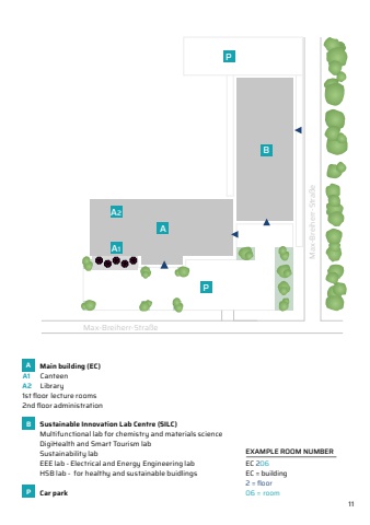 11A Main building (EC)A1 CanteenA2 Library 1st floor lecture rooms 2nd floor administrationB Sustainable Innovation Lab Centre (SILC)Multifunctional lab for chemistry and materials scienceDigiHealth and Smart Tourism labSustainability lab EEE lab - Electrical and Energy Engineering labHSB lab - for healthy and sustainable buidlingsP Car parkEXAMPLE ROOM NUMBEREC 206EC = building2 = floor06 = roomMax-Breiherr-Stra%u00dfeMax-Breiherr-Stra%u00dfeAA1A2BPP