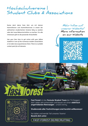 Hochschulvereine | Student Clubs & AssociationsMehr Infos auf unserer Website/More informationon our WebsiteNutze doch deine freie Zeit, um mit deinen Kommilitonen und Kommilitoninnen in einem der zahlreichen studentischen Vereine t%u00e4tig zu werden oder dort neue Bekanntschaften zu machen. F%u00fcr alle Interessen gibt es die passende Anlaufstelle:Use your free time to get active with your fellow students in one of the numerous student associations or to make new acquaintances there. There is a suitable contact point for all interests:Fast Forest ist das Formula Student Team der TH Deggendorf. Jedes Jahr entwickeln und bauen wir einen elektrisch angetriebenen Rennwagen - unsere Jenny.Studierende aller Fachrichtungen sind herzlich willkommen!Sei dabei und werde Teil unseres Teams!Bewirb dich unter:Instagram FAST-FOREST.DE/RECRUITING