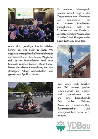 Ein weiterer Schwerpunkt unserer Arbeit liegt in der Organisation von Vortr%u00e4gen und Exkursionen, die es unseren Mitgliedern erm%u00f6glichen, sich mit Experten aus der Praxis zu vernetzen und ihr Wissen %u00fcber aktuelle Entwicklungen in der Bauindustrie zu erweitern.Auch das gesellige Hochschulleben kommt bei uns nicht zu kurz. Wir organisieren regelm%u00e4%u00dfig Veranstaltungen und Stammtische, bei denen Mitglieder sich besser kennenlernen und neue Kontakte kn%u00fcpfen k%u00f6nnen. Diese Events bieten die ideale Atmosph%u00e4re, um vom stressigen Alltag abzuschalten und gemeinsam Spa%u00df zu haben.Wir laden dich herzlich ein, Teil unserer gro%u00dfen Gemeinschaft zu werden und gemeinsam mit uns eine bereichernde Zeit voller Wissen, Austausch, Freundschaften, Zusammenarbeit und unvergesslicher Erlebnisse zu erleben.