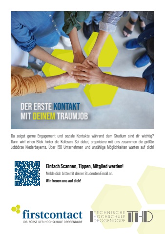 DER ERSTE KONTAKTMIT DEINEM TRAUMJOBDu zeigst gerne Engagement und soziale Kontakte w%u00e4hrend dem Studium sind dir wichtig?Dann wirf einen Blick hinter die Kulissen. Sei dabei, organisiere mit uns zusammen die gr%u00f6%u00dfte Jobb%u00f6rse Niederbayerns. %u00dcber 150 Unternehmen und unz%u00e4hlige M%u00f6glichkeiten warten auf dich!Einfach Scannen, Tippen, Mitglied werden!Melde dich bitte mit deiner Studenten Email an.Wir freuen uns auf dich!