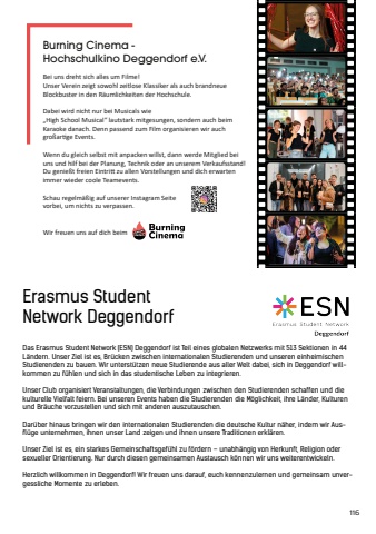 116Erasmus Student Network DeggendorfDas Erasmus Student Network (ESN) Deggendorf ist Teil eines globalen Netzwerks mit 513 Sektionen in 44 L%u00e4ndern. Unser Ziel ist es, Br%u00fccken zwischen internationalen Studierenden und unseren einheimischen Studierenden zu bauen. Wir unterst%u00fctzen neue Studierende aus aller Welt dabei, sich in Deggendorf willkommen zu f%u00fchlen und sich in das studentische Leben zu integrieren.Unser Club organisiert Veranstaltungen, die Verbindungen zwischen den Studierenden schaffen und die kulturelle Vielfalt feiern. Bei unseren Events haben die Studierenden die M%u00f6glichkeit, ihre L%u00e4nder, Kulturen und Br%u00e4uche vorzustellen und sich mit anderen auszutauschen. Dar%u00fcber hinaus bringen wir den internationalen Studierenden die deutsche Kultur n%u00e4her, indem wir Ausfl%u00fcge unternehmen, ihnen unser Land zeigen und ihnen unsere Traditionen erkl%u00e4ren. Unser Ziel ist es, ein starkes Gemeinschaftsgef%u00fchl zu f%u00f6rdern %u2013 unabh%u00e4ngig von Herkunft, Religion oder sexueller Orientierung. Nur durch diesen gemeinsamen Austausch k%u00f6nnen wir uns weiterentwickeln.Herzlich willkommen in Deggendorf! Wir freuen uns darauf, euch kennenzulernen und gemeinsam unvergessliche Momente zu erleben.Burning Cinema - Hochschulkino Deggendorf e.V.Bei uns dreht sich alles um Filme! Unser Verein zeigt sowohl zeitlose Klassiker als auch brandneue Blockbuster in den R%u00e4umlichkeiten der Hochschule.Dabei wird nicht nur bei Musicals wie %u201eHigh School Musical%u201c lautstark mitgesungen, sondern auch beim Karaoke danach. Denn passend zum Film organisieren wir auch gro%u00dfartige Events.Wenn du gleich selbst mit anpacken willst, dann werde Mitglied bei uns und hilf bei der Planung, Technik oder an unserem Verkaufsstand! Du genie%u00dft freien Eintritt zu allen Vorstellungen und dich erwarten immer wieder coole Teamevents.Schau regelm%u00e4%u00dfig auf unserer Instagram Seite vorbei, um nichts zu verpassen.Wir freuen uns auf dich beim
