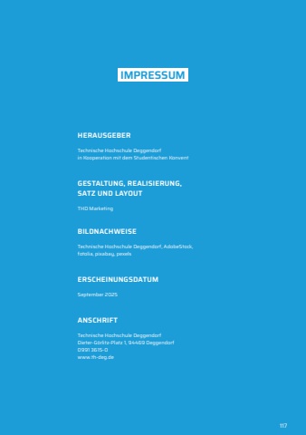 117IMPRESSUM117HERAUSGEBER Technische Hochschule Deggendorfin Kooperation mit dem Studentischen KonventGESTALTUNG, REALISIERUNG, SATZ UND LAYOUT THD MarketingBILDNACHWEISE Technische Hochschule Deggendorf, AdobeStock, fotolia, pixabay, pexelsERSCHEINUNGSDATUM September 2025ANSCHRIFT Technische Hochschule DeggendorfDieter-G%u00f6rlitz-Platz 1, 94469 Deggendorf0991 3615-0www.th-deg.de