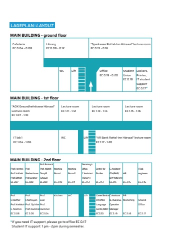 MAIN BUILDING - ground floorMAIN BUILDING - 1st floorMAIN BUILDING - 2nd floor*If you need IT support, please go to office EC 0.17 Student IT support: 1 pm - 2pm during semester.WC LiftIT lab engineersEC 2.16SharedOfficeEC 2.17PRMarketingEC 2.18C. AssistantIE, HSB, ESE, Operative ManagerEC 2.19Career ServiceInt. OfficeLanguageCentre, MINTEC 2.20HREC 2.15C. Assistant ITM/BAS/BPP/MDH/HIEC 2.14Centre for StudiesEC 2.13Secretary%u2018sOffice, C. AssistantITD/GPH EC 2.12MeetingRoom 2EC 2.11MeetingRoom 1EC 2.10Prof. KitchenChaltikyanProf. SpittlerProf. RummelEC 2.05Prof.LaarProf. H%u00fcmmerEC 2.04Prof.C-KoetherProf. KreiskottC. NikitsinEC 2.06Prof. BrotsackProf. M%u00e1t%u00e9fiTempfliSchauerEC 2.09Prof. HerntreiProf. VolchekProf. DittrichEC 2.07Prof. SteckenbauerProf. LindnerEC 2.08Cafeteria EC 0.04 - 0.08WC LiftLibrary EC 0.09 - 0.12Office EC 0.19 - 0.20StudentUnionEC 0.18Lockers,Printer,IT student supportEC 0.17*%u201cSparkasse Rottal-Inn H%u00f6rsaal%u201c lecture roomEC 0.13 - 0.16WC LiftLecture roomEC 1.11 - 1.12Lecture roomEC 1.13 - 1.14Lecture roomEC 1.15 - 1.16%u201cAOK Gesundheitskasse H%u00f6rsaal%u201cLecture roomEC 1.07 - 1.10%u201cVR Bank Rottal-Inn H%u00f6rsaal%u201c lecture roomEC 1.17 - 1.20IT lab 1EC 1.04 - 1.06LAGEPLAN %ufffd LAYOUT