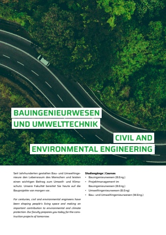 Seit Jahrhunderten gestalten Bau- und Umweltingenieure den Lebensraum des Menschen und leisten einen wichtigen Beitrag zum Umwelt- und Klimaschutz. Unsere Fakult%u00e4t bereitet Sie heute auf die Bauprojekte von morgen vor.For centuries, civil and environmental engineers have been shaping people%u2018s living space and making an important contribution to environmental and climate protection. Our faculty prepares you today for the construction projects of tomorrow.Studieng%u00e4nge | Courses%u2022 Bauingenieurwesen (B.Eng.)%u2022 Projektmanagement im Bauingenieurwesen (B.Eng.)%u2022 Umweltingenieurwesen (B.Eng)%u2022 Bau- und Umweltingenieurwesen (M.Eng.)BAUINGENIEURWESEN UND UMWELTTECHNIKCIVIL AND ENVIRONMENTAL ENGINEERING