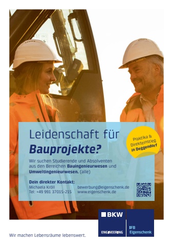 Leidenschaft f%u00fcr Bauprojekte?Wir machen Lebensr%u00e4ume lebenswert.Wir suchen Studierende und Absolventen aus den Bereichen Bauingenieurwesen und Umweltingenieurwesen. (alle)Dein direkter Kontakt: Michaela Kr%u00f6llTel: +49 991 37015-215bewerbung@eigenschenk.de www.eigenschenk.dePraktika & Direkteinstieg in Deggendorf
