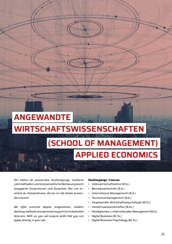 21Wir bieten dir praxisnahe Studieng%u00e4nge, moderne Lehrmethoden und eine pers%u00f6nliche Betreuung durch engagierte Dozentinnen und Dozenten. Bei uns erwirbst du Kompetenzen, die du im Job direkt anwenden kannst.We offer practical degree programmes, modern teaching methods and personal support from dedicated lecturers. With us, you will acquire skills that you can apply directly in your job.Studieng%u00e4nge | Courses%u2022 Volkswirtschaftslehre (B.Sc.)%u2022 Betriebswirtschaft (B.A.)%u2022 International Management (B.A.)%u2022 Tourismusmanagement (B.A.)%u2022 Angewandte Wirtschaftspsychologie (B.Sc.)%u2022 Verkehrswissenschaften (B.Sc.)%u2022 Strategisches u. Internationales Management (M.A.)%u2022 Digital Business (M. Sc.)%u2022 Digital Business Psychology (M. Sc.)ANGEWANDTE WIRTSCHAFTSWISSENSCHAFTEN(SCHOOL OF MANAGEMENT)APPLIED ECONOMICS