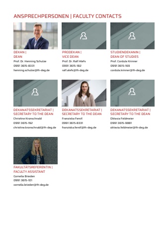 ANSPRECHPERSONEN | FACULTY CONTACTSDEKANATSSEKRETARIAT |SECRETARY TO THE DEANFranziska Ferstl0991 3615-8331franziska.ferstl@th-deg.deDEKANATSSEKRETARIAT |SECRETARY TO THE DEANChristine Kronschnabl0991 3615-192christine.kronschnabl@th-deg.deDEKAN |DEANProf. Dr. Henning Schulze0991 3615-8331henning.schulze@th-deg.dePRODEKAN |VICE DEANProf. Dr. Ralf Alefs0991 3615-182ralf.alefs@th-deg.deSTUDIENDEKANIN |DEAN OF STUDIESProf. Cordula Krinner 0991 3615-169cordula.krinner@th-deg.deDEKANATSSEKRETARIAT |SECRETARY TO THE DEANOktavia Feldmeier0991 3615-9881oktavia.feldmeier@th-deg.deFAKULT%u00c4TSREFERENTIN |FACULTY ASSISTANTCornelia Brieden0991 3615-101cornelia.brieden@th-deg.de