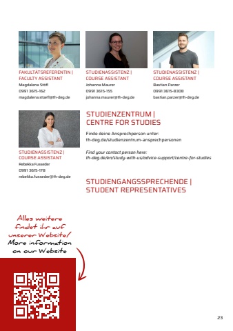 23Alles weitere findet ihr auf unserer Website/More informationon our WebsiteFAKULT%u00c4TSREFERENTIN |FACULTY ASSISTANTMagdalena St%u00f6fl0991 3615-162magdalena.stoefl@th-deg.deSTUDIENASSISTENZ |COURSE ASSISTANTJohanna Maurer0991 3615-155johanna.maurer@th-deg.deSTUDIENASSISTENZ |COURSE ASSISTANTBastian Parzer0991 3615-8308bastian.parzer@th-deg.deSTUDIENGANGSSPRECHENDE |STUDENT REPRESENTATIVESSTUDIENASSISTENZ |COURSE ASSISTANTRebekka Fusseder 0991 3615-178rebekka.fusseder@th-deg.deSTUDIENZENTRUM |CENTRE FOR STUDIESFinde deine Ansprechperson unter:th-deg.de/studienzentrum-ansprechpersonenFind your contact person here:th-deg.de/en/study-with-us/advice-support/centre-for-studies