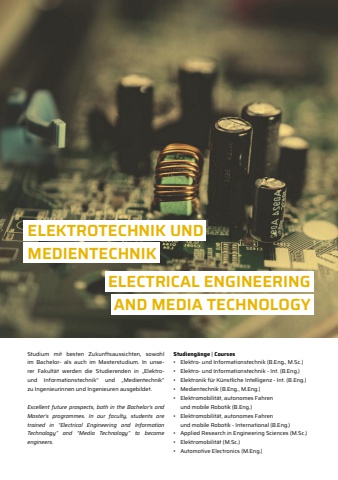 Studium mit besten Zukunftsaussichten, sowohl im Bachelor- als auch im Masterstudium. In unserer Fakult%u00e4t werden die Studierenden in %u201eElektround Informationstechnik%u201c und %u201eMedientechnik%u201c zu Ingenieurinnen und Ingenieuren ausgebildet.Excellent future prospects, both in the Bachelor%u2018s and Master%u2018s programmes. In our faculty, students are trained in %u201cElectrical Engineering and Information Technology%u201d and %u201cMedia Technology%u201d to become engineers.Studieng%u00e4nge | Courses%u2022 Elektro- und Informationstechnik (B.Eng., M.Sc.)%u2022 Elektro- und Informationstechnik - Int. (B.Eng.)%u2022 Elektronik f%u00fcr K%u00fcnstliche Intelligenz - Int. (B.Eng.)%u2022 Medientechnik (B.Eng., M.Eng.)%u2022 Elektromobilit%u00e4t, autonomes Fahren und mobile Robotik (B.Eng.)%u2022 Elektromobilit%u00e4t, autonomes Fahren und mobile Robotik - International (B.Eng.)%u2022 Applied Research in Engineering Sciences (M.Sc.)%u2022 Elektromobilit%u00e4t (M.Sc.)%u2022 Automotive Electronics (M.Eng.)ELEKTROTECHNIK UNDMEDIENTECHNIKELECTRICAL ENGINEERING AND MEDIA TECHNOLOGY