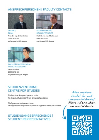 27ANSPRECHPERSONEN | FACULTY CONTACTSFAKULT%u00c4TSREFERENTIN |FACULTY ASSISTANTTanja Schreiner0991 3615-301tanja.schreiner@th-deg.deDEKAN |DEANProf. Dr.-Ing. Stefan G%u00f6tze0991 3615-311stefan.goetze@th-deg.deSTUDIENDEKAN |DEAN OF STUDIESProf. Dr. rer. nat. Martin Aust0991 3615-317martin.aust@th-deg.deAlles weitere findet ihr auf unserer Website/More informationon our WebsiteSTUDIENGANGSSPRECHENDE |STUDENT REPRESENTATIVESSTUDIENZENTRUM |CENTRE FOR STUDIESFinde deine Ansprechperson unter:th-deg.de/studienzentrum-ansprechpersonenFind your contact person here:th-deg.de/en/study-with-us/advice-support/centre-for-studies