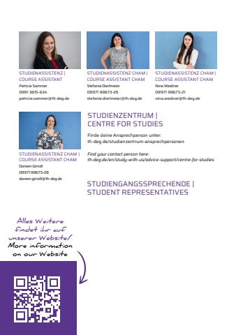 Alles Weitere findet ihr auf unserer Website/More informationon our WebsiteSTUDIENASSISTENZ |COURSE ASSISTANTPatricia Sammer0991 3615-634patricia.sammer@th-deg.deSTUDIENASSISTENZ CHAM |COURSE ASSISTANT CHAMStefanie Dierlmeier09971 99673-29stefanie.dierlmeier@th-deg.deSTUDIENASSISTENZ CHAM |COURSE ASSISTANT CHAMDoreen Girndt09971 99673-28doreen.girndt@th-deg.deSTUDIENASSISTENZ CHAM |COURSE ASSISTANT CHAMNina Weidner09971 99673-21nina.weidner@th-deg.deSTUDIENGANGSSPRECHENDE |STUDENT REPRESENTATIVESSTUDIENZENTRUM |CENTRE FOR STUDIESFinde deine Ansprechperson unter:th-deg.de/studienzentrum-ansprechpersonenFind your contact person here:th-deg.de/en/study-with-us/advice-support/centre-for-studies