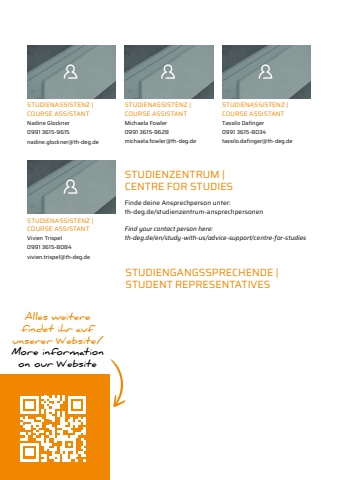 Alles weitere findet ihr auf unserer Website/More informationon our WebsiteSTUDIENASSISTENZ |COURSE ASSISTANTNadine Glockner 0991 3615-9615nadine.glockner@th-deg.deSTUDIENASSISTENZ |COURSE ASSISTANTVivien Trispel0991 3615-8084vivien.trispel@th-deg.deSTUDIENASSISTENZ |COURSE ASSISTANTMichaela Fowler0991 3615-9628michaela.fowler@th-deg.deSTUDIENGANGSSPRECHENDE |STUDENT REPRESENTATIVESSTUDIENASSISTENZ |COURSE ASSISTANTTassilo Dafinger0991 3615-8034tassilo.dafinger@th-deg.deSTUDIENZENTRUM |CENTRE FOR STUDIESFinde deine Ansprechperson unter:th-deg.de/studienzentrum-ansprechpersonenFind your contact person here:th-deg.de/en/study-with-us/advice-support/centre-for-studies