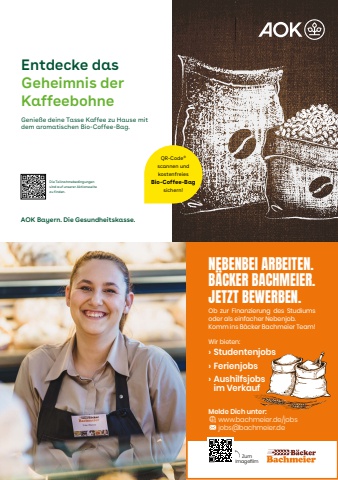 Entdecke dasGeheimnis der KaffeebohneGenie%u00dfe deine Tasse Kaffee zu Hause mit dem aromatischen Bio-Coffee-Bag.AOK Bayern. Die Gesundheitskasse.Die Teilnahmebedingungen sind auf unserer Aktionsseite zu finden.CMYCMMYCYCMYKQR-Code%u00ae scannen und kostenfreies Bio-Coffee-Bagsichern!AOK_BY_Versandaktion_Geheimnis-Kaffeebohne_Anzeige_A5-quer_V3.indd 1 22.01.25 09:5 ZumImagefilmNEBENBEI ARBEITEN.B%u00c4CKER BACHMEIER.JETZT BEWERBEN.Ob zur Finanzierung des Studiums oder als einfacher Nebenjob. Komm ins B%u00e4cker Bachmeier Team!Wir bieten:%u203a Studentenjobs%u203a Ferienjobs%u203a Aushilfsjobsim Verkaufwww.bachmeier.de/jobsjobs@bachmeier.deMelde Dich unter: