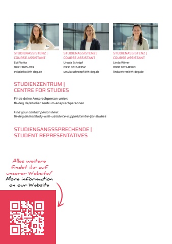 Alles weitere findet ihr auf unserer Website/More informationon our WebsiteSTUDIENASSISTENZ |COURSE ASSISTANTEvi Piatka0991 3615-359evi.piatka@th-deg.deSTUDIENASSISTENZ |COURSE ASSISTANTUrsula Schr%u00f6pf0991 3615-8352ursula.schroepf@th-deg.deSTUDIENASSISTENZ |COURSE ASSISTANTLinda Wirrer0991 3615-8390linda.wirrer@th-deg.deSTUDIENGANGSSPRECHENDE |STUDENT REPRESENTATIVESSTUDIENZENTRUM |CENTRE FOR STUDIESFinde deine Ansprechperson unter:th-deg.de/studienzentrum-ansprechpersonenFind your contact person here:th-deg.de/en/study-with-us/advice-support/centre-for-studies
