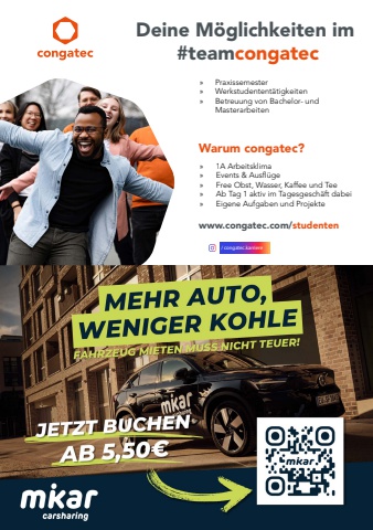 %u00bb Praxissemester%u00bb Werkstudentent%u00e4tigkeiten%u00bb Betreuung von Bachelor- undMasterarbeitenDeine M%u00f6glichkeiten im #teamcongatec%u00bb 1A Arbeitsklima%u00bb Events & Ausfl%u00fcge%u00bb Free Obst, Wasser, Kaffee und Tee%u00bb Ab Tag 1 aktiv im Tagesgesch%u00e4ft dabei%u00bb Eigene Aufgaben und ProjekteWarum congatec?www.congatec.com/studenten/ congatec.karriere / congatec.karriere