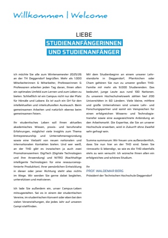 Willkommen | Welcomeich m%u00f6chte Sie alle zum Wintersemester 2025/26 an der TH Deggendorf begr%u00fc%u00dfen. Mehr als 1.000 Mitarbeiterinnen & Mitarbeiter, Professorinnen & Professoren arbeiten jeden Tag daran, Ihnen allen ein optimales Umfeld zum Lernen und zum Leben zu bieten. Schlie%u00dflich ist ein Campus nicht nur der Platz f%u00fcr H%u00f6rs%u00e4le und Labore. Es ist auch ein Ort f%u00fcr den intellektuellen und interkulturellen Austausch. Beim gemeinsamen Arbeiten und nat%u00fcrlich ebenso beim gemeinsamen Feiern. Ihr studentisches Leben soll Ihnen aktuelles akademisches Wissen, praxis- und berufsnahe Erfahrungen, m%u00f6glichst viele Insights zum Thema Entrepreneurship und Unternehmensgr%u00fcndung sowie eine Vielzahl von neuen nationalen und internationalen Kontakten bieten. Und wer wei%u00df, an der THD gibt es inzwischen ja auch zwei Promotionszentren: DigiTech (Digitale Technologien und ihre Anwendung) und NITRO (Nachhaltige intelligente Technologien f%u00fcr eine ressourcenoptimierte Produktion). Ihrer pers%u00f6nlichen Entwicklung in dieser oder jener Richtung steht also nichts im Wege. Wir werden Sie gerne dabei begleiten, unterst%u00fctzen und motivieren.Ich lade Sie au%u00dferdem ein, unser Campus-Leben mitzugestalten. Sei es in einem der studentischen Vereine, im studentischen Konvent oder eben bei den vielen Veranstaltungen, die jedes Jahr auf unseren Campi stattfinden. Mit dem Studienbeginn an einem unserer Lehrstandorte in Deggendorf, Pfarrkirchen oder Cham geh%u00f6ren Sie nun zu unserer gro%u00dfen THDFamilie mit mehr als 9.000 Studierenden. Das bedeutet, junge Leute aus rund 100 Nationen. Zu unserem Hochschulnetzwerk z%u00e4hlen fast 200 Universit%u00e4ten in 60 L%u00e4ndern. Viele kleine, mittlere und gro%u00dfe Unternehmen sind unsere Lehr- und Forschungspartner und somit ein Versprechen f%u00fcr einen erfolgreichen Wissens- und Technologietransfer sowie eine ausgezeichnete Anbindung an den Arbeitsmarkt. Die Expertise, die Sie an unserer Hochschule erwerben, wird in Zukunft ohne Zweifel sehr gefragt sein. Summa summarum: Wir freuen uns au%u00dferordentlich, dass Sie nun hier an der THD sind. Seien Sie %u00bbinnovativ & lebendig%u00ab, so wie es die THD ebenfalls stets zu sein versucht. Ich w%u00fcnsche Ihnen allen ein erfolgreiches und sch%u00f6nes Studium. IhrPROF. WALDEMAR BERGPr%u00e4sident der Technischen Hochschule DeggendorfLIEBESTUDIENANF%u00c4NGERINNENUND STUDIENANF%u00c4NGER