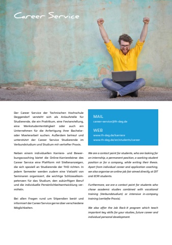 Career ServiceDer Career Service der Technischen Hochschule Deggendorf versteht sich als Anlaufstelle f%u00fcr Studierende, die ein Praktikum, eine Festanstellung, eine Werkstudentent%u00e4tigkeit oder auch ein Unternehmen f%u00fcr die Anfertigung ihrer Bacheloroder Masterarbeit suchen. Au%u00dferdem betreut und unterst%u00fctzt der Career Service Studierende im Verbundstudium und Studium mit vertiefter Praxis.Neben einem individuellen Karriere- und Bewerbungscoaching bietet die Online-Karriereb%u00f6rse des Career Service eine Plattform mit Stellenanzeigen, die sich speziell an Studierende der THD richten. In jedem Semester werden zudem eine Vielzahl von Seminaren organisiert, die wichtige Schl%u00fcsselkompetenzen f%u00fcr das Studium, den zuk%u00fcnftigen Beruf und die individuelle Pers%u00f6nlichkeitsentwicklung vermitteln. Bei allen Fragen rund um Stipendien ber%u00e4t und informiert der Career Service gerne %u00fcber verschiedene M%u00f6glichkeiten.We are a contact point for students, who are looking for an internship, a permanent position, a working student position or for a company, while writing their thesis. Apart from individual career and application coaching, we also organise an online job fair aimed directly at DIT and ECRI students.Furthermore, we are a contact point for students who chose academic studies combined with vocational training (Verbundstudium) or intensive in-company training (vertiefte Praxis).We also offer the Job Rock-It program which teach important key skills for your studies, future career and individual personal development.MAILcareer-service@th-deg.deWEBwww.th-deg.de/karrierewww.th-deg.de/en/students/career