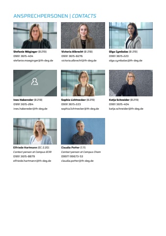 ANSPRECHPERSONEN | CONTACTSOlga Cymbalas (B 219)0991 3615-223olga.cymbalas@th-deg.deElfriede Hartmann (EC 2.20)Contact person at Campus ECRI0991 3615-8879elfriede.hartmann@th-deg.deSophia Lichtnecker (B219)0991 3615-223sophia.lichtnecker@th-deg.deClaudia Potter (1.11)Contact person at Campus Cham09971 99673-53claudia.potter@th-deg.deStefanie M%u00f6ginger (B219)0991 3615-404stefanie.moeginger@th-deg.deVictoria Albrecht (B 218)0991 3615-8276victoria.albrecht@th-deg.deInes Habereder (B218)0991 3615-284ines.habereder@th-deg.deKatja Schneider (B219)0991 3615-404katja.schneider@th-deg.de