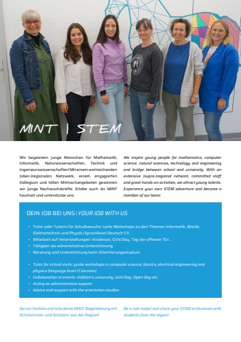 Wir begeistern junge Menschen f%u00fcr Mathematik, Informatik, Naturwissenschaften, Technik und Ingenieurswissenschaften! Mit einem weitreichenden (%u00fcber-)regionalen Netzwerk, einem engagierten Kollegium und tollen Mitmachangeboten gewinnen wir junge Nachwuchskr%u00e4fte. Erlebe auch du MINT hautnah und unterst%u00fctze uns:We inspire young people for mathematics, computer science, natural sciences, technology and engineering and bridge between school and university. With an extensive (supra-)regional network, committed staff and great hands-on activities, we attract young talents. Experience your own STEM adventure and become a member of our team:MINT | STEMDEIN JOB BEI UNS %ufffd YOUR JOB WITH US%u2022 Tutor oder Tutorin f%u00fcr Schulbesuche: Leite Workshops zu den Themen Informatik, Bionik, Elektrotechnik und Physik (Sprachlevel Deutsch C1)%u2022 Mitarbeit auf Veranstaltungen: Kinderuni, Girls%u2018Day, Tag der offenen T%u00fcr...%u2022 T%u00e4tigkeit als administrative Unterst%u00fctzung%u2022 Beratung und Unterst%u00fctzung beim Orientierungsstudium%u2022 Tutor for school visits: guide workshops in computer science, bionics, electrical engineering and physics (language level C1 German)%u2022 Collaboration at events: children%u2018s university, Girls%u2018Day, Open Day etc.%u2022 Acting as administrative support%u2022 Advice and support with the orientation studiesSei ein Vorbild und teile deine MINT-Begeisterung mit Sch%u00fclerinnen und Sch%u00fclern aus der Region!Be a role model and share your STEM enthusiasm with students from the region!
