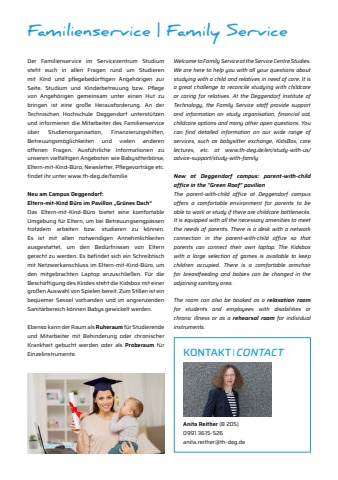 Der Familienservice im Servicezentrum Studium steht euch in allen Fragen rund um Studieren mit Kind und pflegebed%u00fcrftigen Angeh%u00f6rigen zur Seite. Studium und Kinderbetreuung bzw. Pflege von Angeh%u00f6rigen gemeinsam unter einen Hut zu bringen ist eine gro%u00dfe Herausforderung. An der Technischen Hochschule Deggendorf unterst%u00fctzen und informieren die Mitarbeiter des Familienservice %u00fcber Studienorganisation, Finanzierungshilfen, Betreuungsm%u00f6glichkeiten und vielen anderen offenen Fragen. Ausf%u00fchrliche Informationen zu unseren vielf%u00e4ltigen Angeboten wie Babysitterb%u00f6rse, Eltern-mit-Kind-B%u00fcro, Newsletter, Pflegevortr%u00e4ge etc. findet ihr unter www.th-deg.de/familieNeu am Campus Deggendorf: Eltern-mit-Kind B%u00fcro im Pavillon %u201eGr%u00fcnes Dach%u201cDas Eltern-mit-Kind-B%u00fcro bietet eine komfortable Umgebung f%u00fcr Eltern, um bei Betreuungsengp%u00e4ssen trotzdem arbeiten bzw. studieren zu k%u00f6nnen. Es ist mit allen notwendigen Annehmlichkeiten ausgestattet, um den Bed%u00fcrfnissen von Eltern gerecht zu werden. Es befindet sich ein Schreibtisch mit Netzwerkanschluss im Eltern-mit-Kind-B%u00fcro, um den mitgebrachten Laptop anzuschlie%u00dfen. F%u00fcr die Besch%u00e4ftigung des Kindes steht die Kidsbox mit einer gro%u00dfen Auswahl von Spielen bereit. Zum Stillen ist ein bequemer Sessel vorhanden und im angrenzenden Sanit%u00e4rbereich k%u00f6nnen Babys gewickelt werden. Ebenso kann der Raum als Ruheraum f%u00fcr Studierende und Mitarbeiter mit Behinderung oder chronischer Krankheit gebucht werden oder als Proberaum f%u00fcr Einzelinstrumente.Welcome to Family Service at the Service Centre Studies. We are here to help you with all your questions about studying with a child and relatives in need of care. It is a great challenge to reconcile studying with childcare or caring for relatives. At the Deggendorf Institute of Technology, the Family Service staff provide support and information on study organisation, financial aid, childcare options and many other open questions. You can find detailed information on our wide range of services, such as babysitter exchange, KidsBox, care lectures, etc. at www.th-deg.de/en/study-with-us/advice-support/study-with-familyNew at Deggendorf campus: parent-with-child office in the \The parent-with-child office at Deggendorf campus offers a comfortable environment for parents to be able to work or study if there are childcare bottlenecks. It is equipped with all the necessary amenities to meet the needs of parents. There is a desk with a network connection in the parent-with-child office so that parents can connect their own laptop. The Kidsbox with a large selection of games is available to keep children occupied. There is a comfortable armchair for breastfeeding and babies can be changed in the adjoining sanitary area. The room can also be booked as a relaxation roomfor students and employees with disabilities or chronic illness or as a rehearsal room for individual instruments.Anita Reither (B 205)0991 3615-526anita.reither@th-deg.deKONTAKT %ufffd CONTACTFamilienservice | Family Service