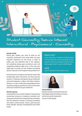 55Student Counselling Service (stucos) Intercultural - Psychosocial - CounsellingStuCoS at ECRIDuring your studies, you want to build up the necessary professional and social skills and gain important experience for the future, in order to realise your own potentials later in life. However, not everything always goes according to plan and unexpected problems might occur. In this case, you might want to contact our new %u201cStudent Counselling Service%u201d (StuCoS) at the European Campus Rottal-Inn!The StuCoS aims at students who feel the need to talk confidentially about themselves and their personal situation. It helps you with general issues of daily life and social integration, conflicts with fellow students, teachers or in your relationship, psychological stress caused by studying, questions or concerns that often come up in connection to your studies etc.StuCoS in personClaudia Nikitsin has a master's degree in psychosocial counselling, training as a telephone counsellor with many years of experience in psychosocial counselling. She has additional training in learning counselling, non-violent communication, trauma, post-traumatic stress disorder, diversity, heterogeneity and mental health.REACH OUTIf you need help or someone to talk to please write an email with a short description of your personal concerns to arrange a personal counselling appointment: stucos-ecri@th-deg.deWEBwww.th-deg.de/ecri#accordion-stucosClaudia NikitsinResearch assistant and Commissioner for Equal Opportunities for Women in Science and the Arts of the Faculty ECRIstucos-ecri@th-deg.de