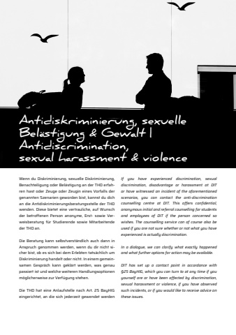 Antidiskriminierung, sexuelle Bel%u00e4stigung & Gewalt |Antidiscrimination, sexual harassment & violenceWenn du Diskriminierung, sexuelle Diskriminierung, Benachteiligung oder Bel%u00e4stigung an der THD erfahren hast oder Zeuge oder Zeugin eines Vorfalls der genannten Szenarien geworden bist, kannst du dich an die Antidiskriminierungsberatungsstelle der THD wenden. Diese bietet eine vertrauliche, auf Wunsch der betroffenen Person anonyme, Erst- sowie Verweisberatung f%u00fcr Studierende sowie Mitarbeitende der THD an. Die Beratung kann selbstverst%u00e4ndlich auch dann in Anspruch genommen werden, wenn du dir nicht sicher bist, ob es sich bei dem Erlebten tats%u00e4chlich um Diskriminierung handelt oder nicht. In einem gemeinsamen Gespr%u00e4ch kann gekl%u00e4rt werden, was genau passiert ist und welche weiteren Handlungsoptionen m%u00f6glicherweise zur Verf%u00fcgung stehen.Die THD hat eine Anlaufstelle nach Art. 25 BayHIG eingerichtet, an die sich jederzeit gewendet werden If you have experienced discrimination, sexual discrimination, disadvantage or harassment at DIT or have witnessed an incident of the aforementioned scenarios, you can contact the anti-discrimination counselling centre at DIT. This offers confidential, anonymous initial and referral counselling for students and employees of DIT if the person concerned so wishes. The counselling service can of course also be used if you are not sure whether or not what you have experienced is actually discrimination. In a dialogue, we can clarify what exactly happened and what further options for action may be available.DIT has set up a contact point in accordance with %u00a725 BayHIG, which you can turn to at any time if you yourself are or have been affected by discrimination, sexual harassment or violence, if you have observed such incidents, or if you would like to receive advice on these issues.