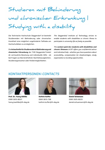 Studieren mit Behinderung und chronischer Erkrankung |Studying with a disabilityDie Technische Hochschule Deggendorf ist bestrebt Studierenden mit Behinderung oder chronischer Krankheit eine m%u00f6glichst ungehinderte Teilhabe am Hochschulleben zu erm%u00f6glichen.Die Anlaufstelle f%u00fcr Studierende mit Behinderung und chronischer Erkrankung der THD Deggendorf bietet dir vertrauliche Beratung und individuelle Hilfe %u2013 ob bei Fragen zur Barrierefreiheit, Nachteilsausgleichen, Studienorganisation oder F%u00f6rderm%u00f6glichkeiten.The Deggendorf Institute of Technology strives to enable students with disabilities or chronic illness to participate in university life as freely as possible. The contact point for students with disabilities and chronic illnesses at DIT offers you confidential advice and individual help - whether you have questions about accessibility, compensation for disadvantages, study organisation or funding opportunities.Prof. Dr. Fanny K%u00e4hlke 0991 3615-8027fanny.kaehlke@th-deg.deKathrin Kuffer0991 3615-738kathrin.kuffer@th-deg.deDaniel Sch%u00fcmann0991 3615-8223daniel.schuemann@th-deg.deKONTAKTPERSONEN %ufffd CONTACTS