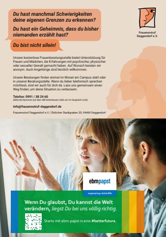 FrauennotrufDeggendorf e.V.Du hast manchmal Schwierigkeiten deine eigenen Grenzen zu erkennen?Du hast ein Geheimnis, dass du bisher niemanden erz%u00e4hlt hast? Du bist nicht allein!Unsere kostenlose Frauenberatungsstelle bietet Unterst%u00fctzung f%u00fcr Frauen und M%u00e4dchen, die Erfahrungen mit psychischer, physischer oder sexueller Gewalt gemacht haben. Auf Wunsch beraten wir anonym. Auch Angeh%u00f6rige sind herzlich willkommen.Unsere Beratungen fi nden einmal im Monat am Campus statt oder in unserer Beratungsstelle. Wenn du lieber telefonisch sprechen m%u00f6chtest, sind wir auch f%u00fcr dich da. Lass uns gemeinsam einen Weg fi nden, um deine Situation zu verbessern. Telefon: 0991 / 38 24 60(bitte die Nummer auf dem AB hinterlassen, falls wir im Gespr%u00e4ch sind)info@frauennotruf-deggendorf.deFrauennotruf Deggendorf e.V. | %u00d6stlicher Stadtgraben 35, 94469 DeggendorfWenn Du glaubst, Du kannst die Welt ver%u00e4ndern, liegst Du bei uns v%u00f6llig richtig.Starte mit ebm-papst in eine #betterfuture.
