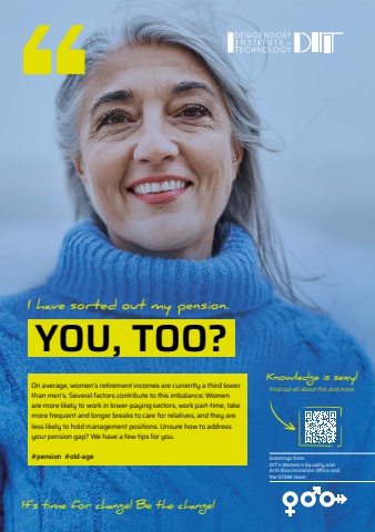 63YOU, TOO?I have sorted out my pension.On average, women%u2018s retirement incomes are currently a third lower than men%u2019s. Several factors contribute to this imbalance: Women are more likely to work in lower-paying sectors, work part-time, take more frequent and longer breaks to care for relatives, and they are less likely to hold management positions. Unsure how to address your pension gap? We have a few tips for you.#pension #old-age It%u2018s time for change! Be the change!Knowledge is sexy!Find out all about this and moreGreetings from DIT%u2019s Women%u2018s Equality and Anti-Discrimination Offi ce and the STEM-team