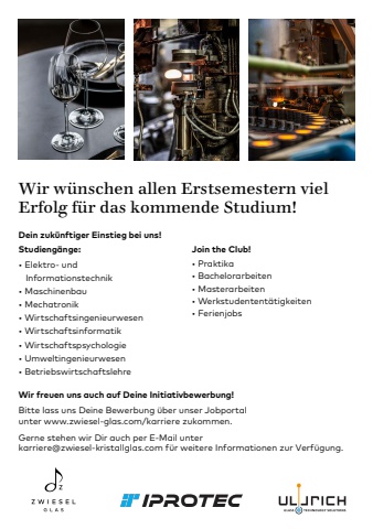 Wir w%u00fcnschen allen Erstsemestern viel Erfolg f%u00fcr das kommende Studium!Studieng%u00e4nge:%u2022 Elektro- undInformationstechnik%u2022 Maschinenbau%u2022 Mechatronik%u2022 Wirtschaftsingenieurwesen%u2022 Wirtschaftsinformatik%u2022 Wirtschaftspsychologie%u2022 Umweltingenieurwesen%u2022 BetriebswirtschaftslehreJoin the Club!%u2022 Praktika%u2022 Bachelorarbeiten%u2022 Masterarbeiten%u2022 Werkstudentent%u00e4tigkeiten%u2022 FerienjobsDein zuk%u00fcnftiger Einstieg bei uns!Wir freuen uns auch auf Deine Initiativbewerbung!Bitte lass uns Deine Bewerbung %u00fcber unser Jobportal unter www.zwiesel-glas.com/karriere zukommen.Gerne stehen wir Dir auch per E-Mail unter karriere@zwiesel-kristallglas.com f%u00fcr weitere Informationen zur Verf%u00fcgung.