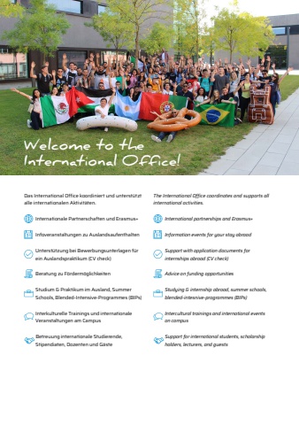 Welcome to the International Office!Das International Office koordiniert und unterst%u00fctzt alle internationalen Aktivit%u00e4ten.Internationale Partnerschaften und Erasmus+ Infoveranstaltungen zu AuslandsaufenthaltenUnterst%u00fctzung bei Bewerbungsunterlagen f%u00fcrein Auslandspraktikum (CV check)Beratung zu F%u00f6rderm%u00f6glichkeitenStudium & Praktikum im Ausland, Summer Schools, Blended-Intensive-Programmes (BIPs) Interkulturelle Trainings und internationale Veranstaltungen am Campus Betreuung internationale Studierende, Stipendiaten, Dozenten und G%u00e4steThe International Office coordinates and supports all international activities.International partnerships and Erasmus+Information events for your stay abroadSupport with application documents for internships abroad (CV check)Advice on funding opportunitiesStudying & internship abroad, summer schools,blended-intesnive-programmes (BIPs)Intercultural trainings and international events on campus Support for international students, scholarshipholders, lecturers, and guests