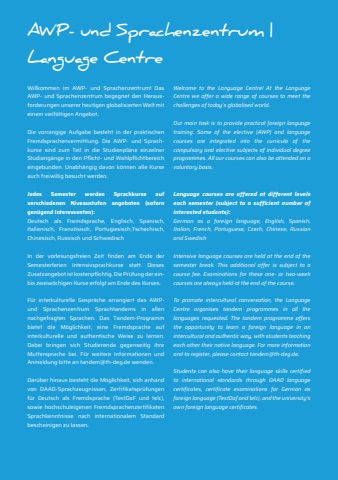 Willkommen im AWP- und Sprachenzentrum! Das AWP- und Sprachenzentrum begegnet den Herausforderungen unserer heutigen globalisierten Welt mit einem vielf%u00e4ltigen Angebot.Die vorrangige Aufgabe besteht in der praktischen Fremdsprachenvermittlung. Die AWP- und Sprachkurse sind zum Teil in die Studienpl%u00e4ne einzelner Studieng%u00e4nge in den Pflicht- und Wahlpflichtbereich eingebunden. Unabh%u00e4ngig davon k%u00f6nnen alle Kurse auch freiwillig besucht werden.Jedes Semester werden Sprachkurse auf verschiedenen Niveaustufen angeboten (sofern gen%u00fcgend Interessenten):Deutsch als Fremdsprache, Englisch, Spanisch, Italienisch, Franz%u00f6sisch, Portugiesisch,Tschechisch, Chinesisch, Russisch und SchwedischIn der vorlesungsfreien Zeit finden am Ende der Semesterferien Intensivsprachkurse statt. Dieses Zusatzangebot ist kostenpflichtig. Die Pr%u00fcfung der einbis zweiw%u00f6chigen Kurse erfolgt am Ende des Kurses.F%u00fcr interkulturelle Gespr%u00e4che arrangiert das AWPund Sprachenzentrum Sprachtandems in allen nachgefragten Sprachen. Das Tandem-Programm bietet die M%u00f6glichkeit, eine Fremdsprache auf interkulturelle und authentische Weise zu lernen. Dabei bringen sich Studierende gegenseitig ihre Muttersprache bei. F%u00fcr weitere Informationen und Anmeldung bitte an tandem@th-deg.de wenden.Dar%u00fcber hinaus besteht die M%u00f6glichkeit, sich anhand von DAAD-Sprachzeugnissen, Zertifikatspr%u00fcfungen f%u00fcr Deutsch als Fremdsprache (TestDaF und telc), sowie hochschuleigenen Fremdsprachenzertifikaten Sprachkenntnisse nach internationalem Standard bescheinigen zu lassen.AWP- und Sprachenzentrum |Language CentreWelcome to the Language Centre! At the Language Centre we offer a wide range of courses to meet the challenges of today%u2018s globalised world.Our main task is to provide practical foreign language training. Some of the elective (AWP) and language courses are integrated into the curricula of the compulsory and elective subjects of individual degree programmes. All our courses can also be attended on a voluntary basis.Language courses are offered at different levels each semester (subject to a sufficient number of interested students):German as a foreign language, English, Spanish, Italian, French, Portuguese, Czech, Chinese, Russian and SwedishIntensive language courses are held at the end of the semester break. This additional offer is subject to a course fee. Examinations for these one- or two-week courses are always held at the end of the course.To promote intercultural conversation, the Language Centre organises tandem programmes in all the languages requested. The tandem programme offers the opportunity to learn a foreign language in an intercultural and authentic way, with students teaching each other their native language. For more information and to register, please contact tandem@th-deg.de.Students can also have their language skills certified to international standards through DAAD language certificates, certificate examinations for German as foreign language (TestDaf and telc), and the university%u2019s own foreign language certificates.
