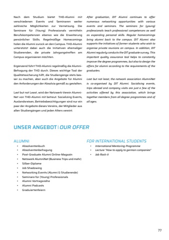 77Nach dem Studium bietet THD-Alumni mit verschiedenen Events und Seminaren weiter zahlreiche M%u00f6glichkeiten zur Vernetzung. Die Seminare f%u00fcr (Young) Professionals vermitteln Berufskompetenzen ebenso wie die Erweiterung pers%u00f6nlicher Skills. Regelm%u00e4%u00dfige Homecomings holen die Alumni zur%u00fcck an den Campus. THD-Alumni unterst%u00fctzt dabei auch die Initiativen ehemaliger Studierenden, die private Jahrgangstreffen am Campus organisieren m%u00f6chten.Erg%u00e4nzend f%u00fchrt THD-Alumni regelm%u00e4%u00dfig die AlumniBefragung der THD durch. Dieses wichtige Tool der Qualit%u00e4tssicherung hilft, die Studieng%u00e4nge stets besser zu machen, aber auch die Angebote f%u00fcr Alumni den Anforderungen der Absolvia gem%u00e4%u00df zu gestalten. Last but not Least, wird der Netzwerk-Verein AlumniNet von THD-Alumni mit betreut. Socializing Events, Auslandsreisen, Betriebsbesichtigungen sind nur ein paar der Angebote dieses Vereins, der Mitglieder aus allen Studieng%u00e4ngen und jeden Alters vereint. After graduation, DIT Alumni continues to offer numerous networking opportunities with various events and seminars. The seminars for (young) professionals teach professional competences as well as expanding personal skills. Regular homecomings bring alumni back to the campus. DIT Alumni also supports the initiatives of former students who wish to organise private reunions on campus. In addition, DIT Alumni regularly conducts the DIT graduate survey. This important quality assurance tool helps to constantly improve the degree programmes, but also to design the offers for alumni according to the requirements of the graduates. Last but not least, the network association AlumniNet is co-organised by DIT Alumni. Socialising events, trips abroad and company visits are just a few of the activities offered by this association, which brings together members from all degree programmes and of all ages. UNSER ANGEBOT %ufffd OUR OFFERALUMNI%u2022 Absolventenbuch%u2022 Absolventenbefragung%u2022 Post-Graduate Alumni Online-Magazin%u2022 Netzwerk AlumniNet (Business Trips und mehr)%u2022 Silber-Diplome%u2022 Job Shadowing%u2022 Networking Events (Alumni & Studierende)%u2022 Seminare f%u00fcr (Young) Professionals%u2022 Alumni Vortragsreihe%u2022 Alumni Podcasts%u2022 GraduiertenfeiernFOR INTERNATIONAL STUDENTS%u2022 International Mentoring Programme%u2022 Lecture %u201cHow to apply to german companies%u201d%u2022 Job Rock-it