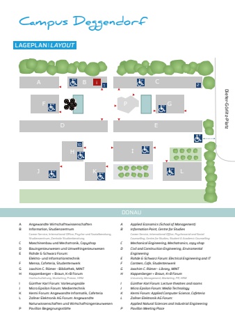 Campus DeggendorfA Angewandte WirtschaftswissenschaftenB Information, StudienzentrumCareer Service, International Office, Psycho-und Sozialberatung, Studienzentrum, Zentrale StudienberatungC Maschinenbau und Mechatronik, CopyshopD Bauingenieurwesen und UmweltingenieurwesenE Rohde & Schwarz Forum: Elektro- und InformationstechnikF Mensa, Cafeteria, StudentenwerkG Joachim C. R%u00f6mer - Bibliothek, MINTH Kappenberger + Braun, K+B ForumHochschulleitung, Marketing, Presse, HRMI G%u00fcnther Karl Forum: Vorlesungss%u00e4leJ Micro Epsilon Forum: MedientechnikK Kermi Forum: Angewandte Informatik, CafeteriaL Zollner Elektronik AG Forum: Angewandte Naturwissenschaften und WirtschaftsingenieurwesenP Pavillon Begegnungsst%u00e4tteA Applied Economics (School of Management)B Information Point, Centre for StudiesCareer Service, International Office, Psychosocial and Social Counselling, Centre for Studies, Student & Academic CounsellingC Mechanical Engineering, Mechatronics, copy shopD Civil and Construction Engineering, Enviromental EngineeringE Rohde & Schwarz Forum: Electrical Engineering and ITF Canteen, Cafe, StudentenwerkG Joachim C. R%u00f6mer - Library, MINTH Kappenberger + Braun, K+B ForumUniversity Management, Marketing, PR, HRMI G%u00fcnther Karl Forum: Lecture theatres and roomsJ Micro Epsilon Forum: Media TechnologyK Kermi Forum: Applied Computer Science, CafeteriaL Zollner Elektronik AG Forum: Applied Natural Sciences and Industrial EngineeringP Pavillon Meeting PlaceDieter-G%u00f6rlitz-PlatziCELDIJ KHF GA BWCWCWC WC WCWCWC WCiWCWCWCWCWCWCWCWC WC101 2PPLAGEPLAN %ufffd LAYOUTDONAUP