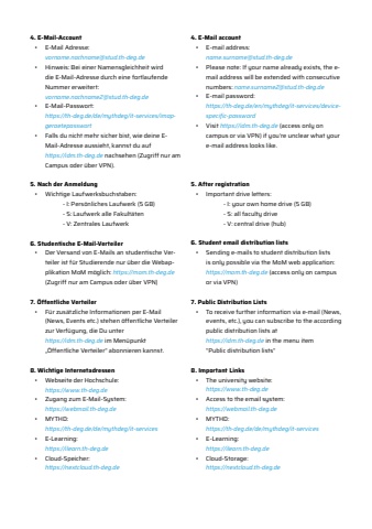 4. E-Mail-Account%u2022 E-Mail Adresse: vorname.nachname@stud.th-deg.de%u2022 Hinweis: Bei einer Namensgleichheit wird die E-Mail-Adresse durch eine fortlaufende Nummer erweitert: vorname.nachname2@stud.th-deg.de%u2022 E-Mail-Passwort:https://th-deg.de/de/mythdeg/it-services/imapgeraetepasswort%u2022 Falls du nicht mehr sicher bist, wie deine EMail-Adresse aussieht, kannst du auf https://idm.th-deg.de nachsehen (Zugriff nur am Campus oder %u00fcber VPN).5. Nach der Anmeldung%u2022 Wichtige Laufwerksbuchstaben:- I: Pers%u00f6nliches Laufwerk (5 GB)- S: Laufwerk alle Fakult%u00e4ten- V: Zentrales Laufwerk6. Studentische E-Mail-Verteiler%u2022 Der Versand von E-Mails an studentische Verteiler ist f%u00fcr Studierende nur %u00fcber die Webapplikation MoM m%u00f6glich: https://mom.th-deg.de(Zugriff nur am Campus oder %u00fcber VPN)7. %u00d6ffentliche Verteiler%u2022 F%u00fcr zus%u00e4tzliche Informationen per E-Mail (News, Events etc.) stehen %u00f6ffentliche Verteiler zur Verf%u00fcgung, die Du unter https://idm.th-deg.de im Men%u00fcpunkt %u201e%u00d6ffentliche Verteiler%u201c abonnieren kannst.8. Wichtige Internetadressen%u2022 Webseite der Hochschule:https://www.th-deg.de%u2022 Zugang zum E-Mail-System:https://webmail.th-deg.de%u2022 MYTHD: https://th-deg.de/de/mythdeg/it-services%u2022 E-Learning:https://ilearn.th-deg.de%u2022 Cloud-Speicher:https://nextcloud.th-deg.de4. E-Mail account%u2022 E-mail address: name.surname@stud.th-deg.de%u2022 Please note: If your name already exists, the email address will be extended with consecutive numbers: name.surname2@stud.th-deg.de%u2022 E-mail password: https://th-deg.de/en/mythdeg/it-services/devicespecific-password%u2022 Visit https://idm.th-deg.de (access only on campus or via VPN) if you%u2018re unclear what your e-mail address looks like.5. After registration%u2022 Important drive letters:- I: your own home drive (5 GB)- S: all faculty drive- V: central drive (hub)6. Student email distribution lists%u2022 Sending e-mails to student distribution lists is only possible via the MoM web application: https://mom.th-deg.de (access only on campus or via VPN)7. Public Distribution Lists%u2022 To receive further information via e-mail (News, events, etc.), you can subscribe to the according public distribution lists athttps://idm.th-deg.de in the menu item %u201cPublic distribution lists%u201c8. Important Links%u2022 The university website:https://www.th-deg.de%u2022 Access to the email system:https://webmail.th-deg.de%u2022 MYTHD: https://th-deg.de/de/mythdeg/it-services%u2022 E-Learning:https://ilearn.th-deg.de%u2022 Cloud-Storage:https://nextcloud.th-deg.de