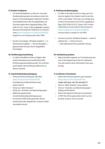 879. Drucken & Kopieren%u2022 Um drucken/kopieren zu k%u00f6nnen, muss der Studierendenausweis einmalig an einem Kopierer mit Kartenleseger%u00e4t registriert werden. Anschlie%u00dfend kann das Druckguthaben am Terminal neben dem Copyshop (Deg: C012, ECRI: EC 0.17, Cham: 0.10) aufgeladen werden. Genaue Informationen findest Du im Intranet unter https://confluence.th-deg.de/x/6505AQ(Zugriff nur am Campus oder %u00fcber VPN)%u2022 Drucker hinzuf%u00fcgen: Windows Explorer -> in Adresszeile eingeben -> \\\\druck (Eingabe) -> gew%u00fcnschten Drucker durch Doppelklick hinzuf%u00fcgen.10. Einf%u00fchrungsveranstaltung%u2022 In vielen Fakult%u00e4ten findet zu Beginn des ersten Semesters eine ausf%u00fchrliche EDVEinf%u00fchrungsveranstaltung statt. Ort und Zeitpunkt dieser Veranstaltung erf%u00e4hrst Du an Deiner Fakult%u00e4t.11. Immatrikulationsbescheinigung%u2022 Primuss-Portal im Browser aufrufen:https://www.primuss.de/portal-thd(Anmeldung mit Benutzerkennung: siehe Punkt 1)%u2022 Klicke auf %u201eMein Studium%u201c%u2022 Klicke auf %u201eAufrufen von Bescheinigungen%u201c%u2022 W%u00e4hle die gew%u00fcnschte Immatrikulationsbescheinigung aus%u2022 Es wird eine PDF-Datei generiert, die Du ausdrucken oder abspeichern und per E-Mail versenden kannst.9. Printing and photocopying%u2022 In order to be able to print or copy, you first have to register the student card at a printer with a card reader. Then you can charge your credit at the terminal next to the Copyshop in Deg: C012, ECRI: EC 0.17, Cham: 0.10. Further information can be found in the intranet at:https://confluence.th-deg.de/x/6505AQ(access only on campus or via VPN)%u2022 Connect a printer: Windows Explorer -> enter in address bar -> \\\\druck (return) -> add selected printer by double clicking.10. Introductory sessions%u2022 Many faculties organise an IT introductory session at the beginning of the first semester. You will receive more information from your faculty.11. Certificate of Enrolment%u2022 Select the Primuss portal in your browser:https://www.primuss.de/portal-thd(Login with your user ID; see point 1)%u2022 Click on %u201cMein Studium%u201d (my studies).%u2022 Click on %u201cAufrufen von Bescheinigungen%u201d (Study certifications).%u2022 Select the desired certificate of enrolment%u2022 A PDF file will be generated, which can be printed, saved or sent via email.