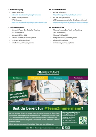 12. Netzwerkzugang%u2022 WLAN %u201eeduroam%u201c: https://th-deg.de/de/mythdeg/it-services%u2022 WLAN %u201e@BayernWlan%u201c%u2022 VPN-Zugang: https://th-deg.de/de/mythdeg/it-services/eduvpn13. Softwareangebote%u2022 Microsoft Azure Dev Tools for Teaching(u.a. Windows 11)%u2022 Microsoft Office 365%u2022 campusAuction (Auktionssystem)%u2022 Pinboard (Kleinanzeigen)%u2022 LimeSurvey Umfragesysteme12. Access to Network%u2022 WLAN %u201ceduroam%u201d:https://th-deg.de/de/mythdeg/it-service%u2022 WLAN %u201c@BayernWlan%u201d%u2022 VPN access externally, for details see Intranet:https://th-deg.de/de/mythdeg/it-services/eduvpn13. Software Offers%u2022 Microsoft Azure Dev Tools for Teaching (incl. Windows 11)%u2022 Microsoft Office 365%u2022 campusAuction (auction system)%u2022 Pinboard (small ads)%u2022 LimeSurvey survey systems%u00fcber 30x in Bayern | www.zimmermann-vital.de | Sanit%u00e4tshausWir schaff en Lebensqualit%u00e4tOrthop%u00e4dietechnik Homecare RehatechnikBei uns arbeitest du am wichtigsten Gut des Menschen %u2013 seiner Gesundheit. Wir sind ein familiengef%u00fchrtes Unternehmen in 4. Generation, das seit %u00fcber 100 Jahren Menschen unterst%u00fctzt, ihre Lebensqualit%u00e4t zu verbessern. Mit rund 30 Filialen sind wir der gr%u00f6%u00dfte Sanit%u00e4tshaus-Filialist in Bayern %u2013 und wir wachsen weiter.Klingt nach deinem neuen Arbeitsplatz? Dann lass uns nicht warten!Zimmermann Sanit%u00e4ts- & Orthop%u00e4diehaus GmbHPersonalmanagementZwickauer Stra%u00dfe 1494315 StraubingTel. 09421 8007 520personal@zimmermannvital.deBist du bereit f%u00fcr #TeamZimmermann?