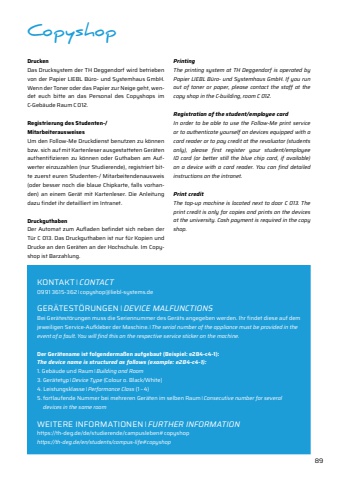 89CopyshopDruckenDas Drucksystem der TH Deggendorf wird betrieben von der Papier LIEBL B%u00fcro- und Systemhaus GmbH. Wenn der Toner oder das Papier zur Neige geht, wendet euch bitte an das Personal des Copyshops im C-Geb%u00e4ude Raum C012.Registrierung des Studenten-/MitarbeiterausweisesUm den Follow-Me Druckdienst benutzen zu k%u00f6nnen bzw. sich auf mit Kartenleser ausgestatteten Ger%u00e4ten authentifizieren zu k%u00f6nnen oder Guthaben am Aufwerter einzuzahlen (nur Studierende), registriert bitte zuerst euren Studenten-/ Mitarbeitendenausweis (oder besser noch die blaue Chipkarte, falls vorhanden) an einem Ger%u00e4t mit Kartenleser. Die Anleitung dazu findet ihr detailliert im Intranet.DruckguthabenDer Automat zum Aufladen befindet sich neben der T%u00fcr C 013. Das Druckguthaben ist nur f%u00fcr Kopien und Drucke an den Ger%u00e4ten an der Hochschule. Im Copyshop ist Barzahlung.PrintingThe printing system at TH Deggendorf is operated by Papier LIEBL B%u00fcro- und Systemhaus GmbH. If you run out of toner or paper, please contact the staff at the copy shop in the C-building, room C 012.Registration of the student/employee cardIn order to be able to use the Follow-Me print service or to authenticate yourself on devices equipped with a card reader or to pay credit at the revaluator (students only), please first register your student/employee ID card (or better still the blue chip card, if available) on a device with a card reader. You can find detailed instructions on the intranet.Print creditThe top-up machine is located next to door C 013. The print credit is only for copies and prints on the devices at the university. Cash payment is required in the copy shop.KONTAKT %ufffd CONTACT0991 3615-362 %ufffd copyshop@liebl-systems.deGER%u00c4TEST%u00d6RUNGEN %ufffd DEVICE MALFUNCTIONSBei Ger%u00e4test%u00f6rungen muss die Seriennummer des Ger%u00e4ts angegeben werden. Ihr findet diese auf dem jeweiligen Service-Aufkleber der Maschine. %ufffd The serial number of the appliance must be provided in the event of a fault. You will find this on the respective service sticker on the machine.Der Ger%u00e4tename ist folgenderma%u00dfen aufgebaut (Beispiel: e284-c4-1):The device name is structured as follows (example: e284-c4-1):1. Geb%u00e4ude und Raum %ufffd Building and Room3. Ger%u00e4tetyp %ufffd Device Type (Colour o. Black/White)4. Leistungsklasse %ufffd Performance Class (1 %u20134)5. fortlaufende Nummer bei mehreren Ger%u00e4ten im selben Raum %ufffd Consecutive number for several devices in the same roomWEITERE INFORMATIONEN %ufffd FURTHER INFORMATIONhttps://th-deg.de/de/studierende/campusleben#copyshophttps://th-deg.de/en/students/campus-life#copyshop