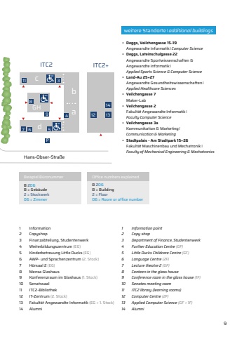 9%u2022 Deggs, Veilchengasse 15-19Angewandte Informatik %ufffd Computer Science%u2022 Deggs, Lateinschulgasse 22Angewandte Sportwissenschaften & Angewandte Informatik %ufffdApplied Sports Science & Computer Science%u2022 Land-Au 25+27Angewandte Gesundheitswissenschaften %ufffdApplied Healthcare Sciences%u2022 Veilchengasse 7Maker-Lab%u2022 Veilchengasse 2Fakult%u00e4t Angewandte Informatik %ufffdFaculty Computer Science%u2022 Veilchengasse 3aKommunikation & Marketing %ufffdCommunication & Marketing%u2022 Stadtpalais - Am Stadtpark 15+26Fakult%u00e4t Maschinenbau und Mechatronik %ufffdFaculty of Mechanical Engineering & MechatronicsBeispiel B%u00fcronummerB 206B = Geb%u00e4ude2 = Stockwerk06 = ZimmerHans-Obser-Stra%u00dfe1 Information2 Copyshop3 Finanzabteilung, Studentenwerk4 Weiterbildungszentrum (EG)5 Kinderbetreuung Little Ducks (EG)6 AWP- und Sprachenzentrum (2. Stock)7 H%u00f6rsaal 2 (EG)8 Mensa Glashaus9 Konferenzraum im Glashaus (1. Stock)10 Senatssaal11 ITC2-Bibliothek12 IT-Zentrum (2. Stock)13 Fakult%u00e4t Angewandte Informatik (EG + 1. Stock)14 Alumni1 Information point 2 Copy shop 3 Department of Finance, Studentenwerk4 Further Education Centre (GF)5 Little Ducks Childcare Centre (GF)6 Language Centre (2F)7 Lecture theatre 2 (GF)8 Canteen in the glass house9 Conference room in the glass house (1F)10 Senates meeting room 11 ITC2 library (learning rooms)12 Computer Centre (2F) 13 Applied Computer Science (GF + 1F)14 Alumniweitere Standorte %ufffd additional buildingsPITC2 ITC2+ WCWCcbadGHWCWCWC987 6P54312 131411Office numbers explainedB 206B = Building2 = Floor06 = Room or office number