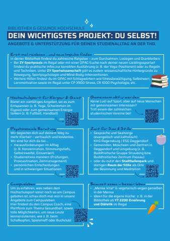 DEIN WICHTIGSTES PROJEKT: DU SELBST!ANGEBOTE & UNTERST%u00dcTZUNG F%u00dcR DEINEN STUDIENALLTAG AN DER THD.BIBLIOTHEK & GESUNDE HOCHSCHULEHochschulsport f%u00fcr K%u00f6rper & GeistBietet ein vielf%u00e4ltiges Angebot, sei es zumEntspannen (z. B. Yoga, Schwimmen imElypso) oder zum gemeinsamen Energietanken (z. B. Fu%u00dfball, Handball) CampuslebenUm zu erfahren, was neben demHochschulsport sonst noch so am Campusgeboten ist, schau doch mal rein in unsereAngebote zum Campusleben.Hier findest du den Campus Coach, einePlattform zum Thema Gesundheit, sowietolle M%u00f6glichkeiten, um neue Leutekennenzulernen, wie z. B. beimSchafkopfen, Spieletreff oder Buchclub!Bewusst essen %u2013 besser leben%u2022 %u201eMensa Vital%u201c & vegetarisch-vegan genie%u00dfenin der Mensa%u2022 Ideen f%u00fcr die eigene K%u00fcche: z. B. in derBibliothek ab YT 2200 Ern%u00e4hrungund Di%u00e4tetik im RegalErst mal reinlesen%u2026 und neue Impulse findenIn deiner Bibliothek findest du zahlreiche Ratgeber %u2013 zum Durchatmen, Loslegen und Dranbleiben:%u2022 Bei ZY Sportpraxis im Regal oder mit einer OPAC-Suche nach deiner neuen Lieblingssportartfindest du praktische Infos zur korrekten Ausf%u00fchrung (z. B. der Yoga-Positionen) oder zu Regeln und Techniken. Unter ZY Sportwissenschaft gibt es zudem wissenschaftliche Hintergr%u00fcnde zuBewegung, Sportpsychologie und Mind-Body-Interventionen.%u2022 Weitere Hilfen findest du im OPAC mit Schlagw%u00f6rtern wie Stressbew%u00e4ltigung, Selbstwert,Lernmotivation sowie im Regal unter CP 3900 Stress, CR 1000 Psychologie, etc.Psychosoziale BeratungWir begleiten dich auf deinem Weg zumehr Klarheit %u2013 vertraulich und kostenlos.Wir sind f%u00fcr dich da bei %u2026%u2022 Herausforderungen im Alltag(z. B. Konzentration, Stimmungstiefs,Selbstzweifel, Einsamkeit)%u2022 Studienstress meistern (Pr%u00fcfungen,Prokrastination, Zeitmanagement)%u2022 pers%u00f6nlichen Entscheidungenund in schwierigen SituationenGemeinsam aktiv werdenKeine Lust auf Sport, aber auf neue Menschen mit gemeinsamen Interessen?Tritt einem der zahlreichenstudentischen Vereine bei!Zeit f%u00fcr Sinn & Stille%u2022 Gespr%u00e4che und Seelsorge(evangelisch und katholisch)KHG Regensburg | ESG Deggendorf%u2022 Gemeinden, Moscheen und Zentren inDeggendorf und Umgebung (z. B.Buddhistische Gruppe Straubing bzw.Buddhistisches Zentrum Passau)%u2022 oder du nutzt den Stadthallenpark unddortigen Raum der Stille als Orteder Besinnung und Meditationwww.th-deg.de