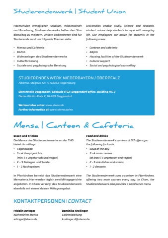 Studierendenwerk | Student UnionHochschulen erm%u00f6glichen Studium, Wissenschaft und Forschung, Studierendenwerke helfen den Studienalltag zu meistern. Unsere Bediensteten sind f%u00fcr Studierende rund um folgende Themen aktiv:%u2022 Mensa und Cafeteria%u2022 BAf%u00f6G%u2022 Wohnanlagen des Studierendenwerks%u2022 Kulturf%u00f6rderung%u2022 Soziale und psychologische BeratungEssen und TrinkenDie Mensa des Studierendenwerks an der THD bietet dir mittags:%u2022 Tagessuppe%u2022 3 %u2013 4 Hauptgerichte (min. 1 x vegetarisch und vegan)%u2022 2 %u2013 3 Beilagen und Salate%u2022 1 %u2013 2 NachspeisenIn Pfarrkirchen betreibt das Studierendenwerk eine Mensateria. Hier werden t%u00e4glich zwei Mittagsgerichte angeboten. In Cham versorgt das Studierendenwerk ebenfalls mit einem kleinen Mittagsangebot.Universities enable study, science and research, student unions help students to cope with everyday life. Our employees are active for students in the following areas:%u2022 Canteen and cafeteria%u2022 BAf%u00f6G%u2022 Housing facilities of the Studierendenwerk%u2022 Cultural support%u2022 Social and psychological counsellingFood and drinksThe Studierendenwerk%u2018s canteen at DIT offers you the following for lunch:%u2022 Soup of the day%u2022 3 - 4 main courses(at least 1 x vegetarian and vegan)%u2022 2 - 3 side dishes and salads%u2022 1 - 2 dessertsThe Studierendenwerk runs a canteen in Pfarrkirchen, offering two main courses every day. In Cham, the Studierendenwerk also provides a small lunch menu. STUDIERENDENWERK NIEDERBAYERN / OBERPFALZAlbertus-Magnus-Str. 4, 93053 RegensburgDienststelle Deggendorf, Geb%u00e4ude ITC2 %ufffd Deggendorf office, Building ITC 2Dieter-G%u00f6rlitz-Platz 2, 94469 DeggendorfWeitere Infos unter: www.stwno.deFurther information at: www.stwno.de/enMensa | Canteen & Cafeteria KONTAKTPERSONEN %ufffd CONTACTFridolin ArtingerK%u00fcchenleiter Mensa artinger@stwno.deDominika KreilingerCafeterialeitungkreilinger.d@stwno.de