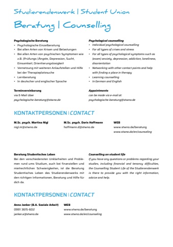 Studierendenwerk | Student UnionBeratung | Counselling Psychologische Beratung%u2022 Psychologische Einzelberatung%u2022 Bei allen Arten von Krisen und Belastungen%u2022 Bei allen Arten von psychischen Symptomen wie z.B. (Pr%u00fcfungs-)%u00c4ngste, Depression, Sucht, Einsamkeit, Orientierungslosigkeit%u2022 Vernetzung mit weiteren Anlaufstellen und Hilfe bei der Therapieplatzsuche%u2022 Lernberatung %u2022 In deutscher und englischer SpracheTerminvereinbarungvia E-Mail %u00fcberpsychologische-beratung@stwno.deM.Sc. psych. Martina Niglnigl.m@stwno.deBeratung Studentisches LebenBei den verschiedensten Unklarheiten und Problemen rund ums Studium, auch bei finanziellen und mietrechtlichen Schwierigkeiten, ist die Beratung Studentisches Leben des Studierendenwerks mit den richtigen Informationen, Beratung und Hilfe f%u00fcr dich da. Anna Janker (B.A. Soziale Arbeit)0991 3615-602janker.a@stwno.de Psychological counselling%u2022 Individual psychological counselling%u2022 For all types of crises and stress%u2022 For all types of psychological symptoms such as (exam) anxiety, depression, addiction, loneliness, disorientation%u2022 Networking with other contact points and help with finding a place in therapy%u2022 Learning counselling%u2022 In German and English Appointmentscan be made via e-mail at:psychologische-beratung@stwno.deCounselling on student lifeIf you have any questions or problems regarding your studies, including financial and tenancy difficulties, the Counselling Student Life of the Studierendenwerk is there to provide you with the right information, advice and help.KONTAKTPERSONEN %ufffd CONTACTKONTAKTPERSONEN %ufffd CONTACTM.Sc. psych. Doris Hoffmannhoffmann.d@stwno.deWEBwww.stwno.de/beratungwww.stwno.de/en/counselingWEBwww.stwno.de/beratungwww.stwno.de/en/counseling