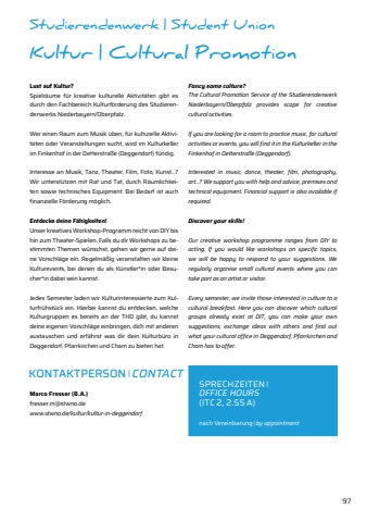 97Studierendenwerk | Student UnionKultur | Cultural Promotion Lust auf Kultur?Spielr%u00e4ume f%u00fcr kreative kulturelle Aktivit%u00e4ten gibt es durch den Fachbereich Kulturf%u00f6rderung des Studierendenwerks Niederbayern/Oberpfalz. Wer einen Raum zum Musik %u00fcben, f%u00fcr kulturelle Aktivit%u00e4ten oder Veranstaltungen sucht, wird im Kulturkeller im Finkenhof in der Detterstra%u00dfe (Deggendorf) f%u00fcndig.Interesse an Musik, Tanz, Theater, Film, Foto, Kunst%u2026? Wir unterst%u00fctzen mit Rat und Tat, durch R%u00e4umlichkeiten sowie technisches Equipment. Bei Bedarf ist auch finanzielle F%u00f6rderung m%u00f6glich.Entdecke deine F%u00e4higkeiten! Unser kreatives Workshop-Programm reicht von DIY bis hin zum Theater-Spielen. Falls du dir Workshops zu bestimmten Themen w%u00fcnschst, gehen wir gerne auf deine Vorschl%u00e4ge ein. Regelm%u00e4%u00dfig veranstalten wir kleine Kulturevents, bei denen du als K%u00fcnstler*in oder Besucher*in dabei sein kannst.Jedes Semester laden wir Kulturinteressierte zum Kulturfr%u00fchst%u00fcck ein. Hierbei kannst du entdecken, welche Kulturgruppen es bereits an der THD gibt, du kannst deine eigenen Vorschl%u00e4ge einbringen, dich mit anderen austauschen und erf%u00e4hrst was dir dein Kulturb%u00fcro in Deggendorf, Pfarrkirchen und Cham zu bieten hat.Fancy some culture?The Cultural Promotion Service of the Studierendenwerk Niederbayern/Oberpfalz provides scope for creative cultural activities. If you are looking for a room to practice music, for cultural activities or events, you will find it in the Kulturkeller in the Finkenhof in Detterstra%u00dfe (Deggendorf).Interested in music, dance, theater, film, photography, art...? We support you with help and advice, premises and technical equipment. Financial support is also available if required.Discover your skills! Our creative workshop programme ranges from DIY to acting. If you would like workshops on specific topics, we will be happy to respond to your suggestions. We regularly organise small cultural events where you can take part as an artist or visitor.Every semester, we invite those interested in culture to a cultural breakfast. Here you can discover which cultural groups already exist at DIT, you can make your own suggestions, exchange ideas with others and find out what your cultural office in Deggendorf, Pfarrkirchen and Cham has to offer.KONTAKTPERSON %ufffd CONTACTMarco Fresser (B.A.)fresser.m@stwno.de www.stwno.de/kultur/kultur-in-deggendorfSPRECHZEITEN %ufffdOFFICE HOURS(ITC 2, 2.55A)nach Vereinbarung %ufffd by appointment